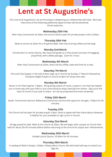 Please contact Revd Dave on vicar@st-augustines.info or just pop into the church just before 2pm on Wednesdays and see what its all about for yourselves, you can be sure of a warm welcome and refreshments.