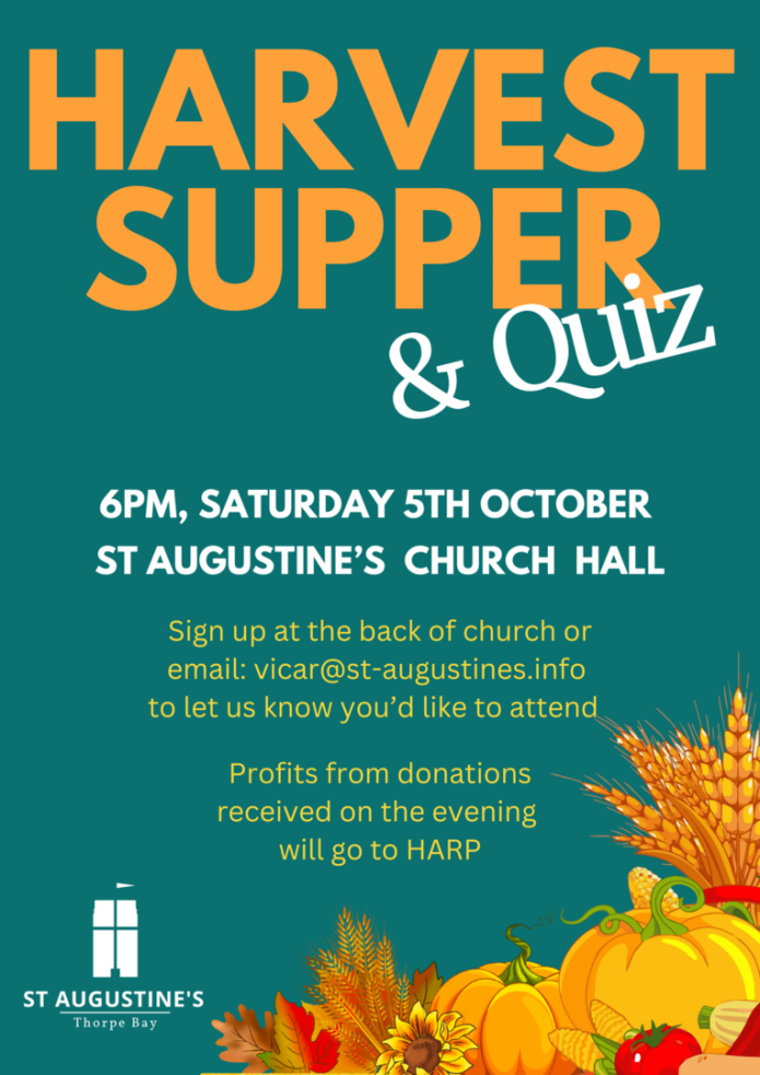 On the evening of Saturday 4th, we hope that you will join us for a Harvest Supper and Quiz in the hall from 6pm. Donations on the evening once the costs are covered will go to HARP. Please sign up at the back of Church from this Sunday morning onwards.