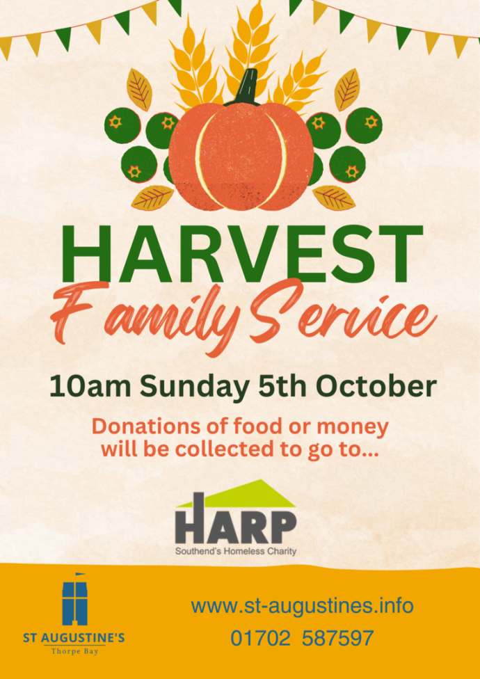 On Sunday 5th, we will have a special Family and Parade Service at 10am to celebrate Harvest. Donations of food and money will go to HARP - the Southend homelessness charity.